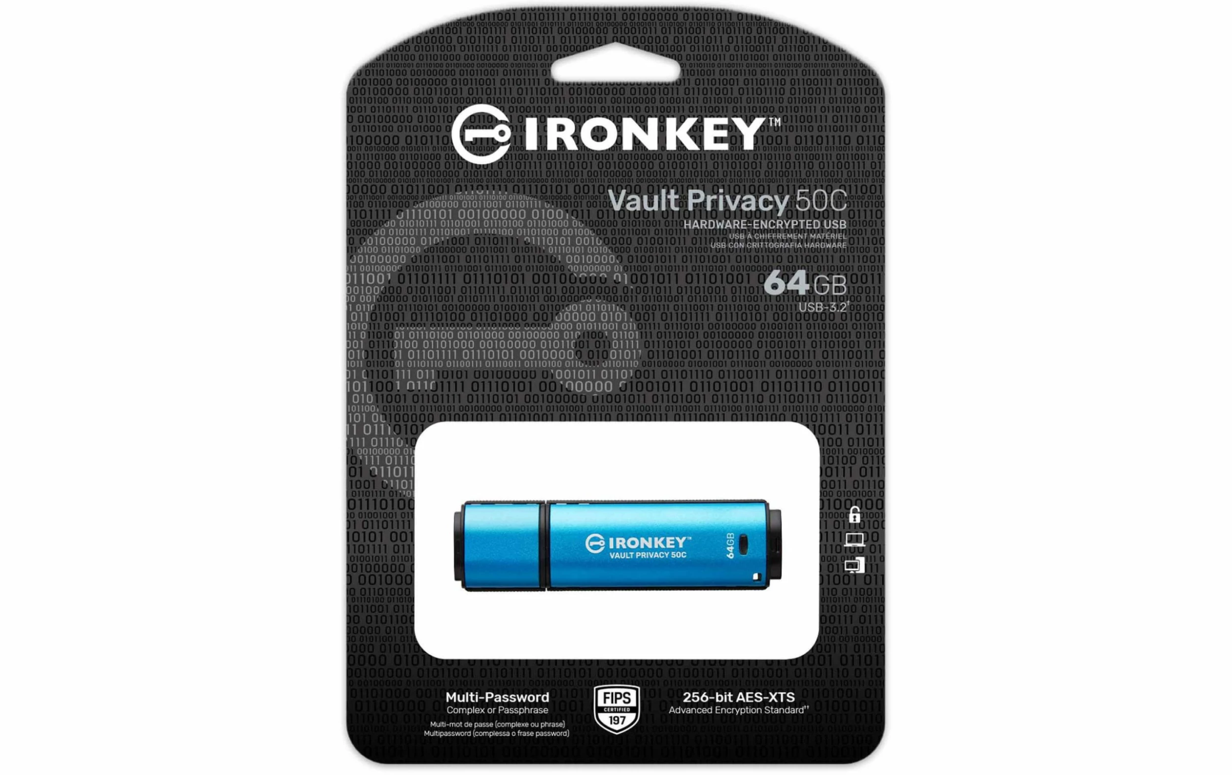 Capacité de mémoire totale: 64 GB, Cryptage du stockage des données: 256-Bit-AES, Couleur de détail: Bleu, Interfaces: Type-C USB 3.0 (3.1 / 3.2 Gen. 1), Forme du périphérique mémoire USB: Standard, Matériau: Non spécifié