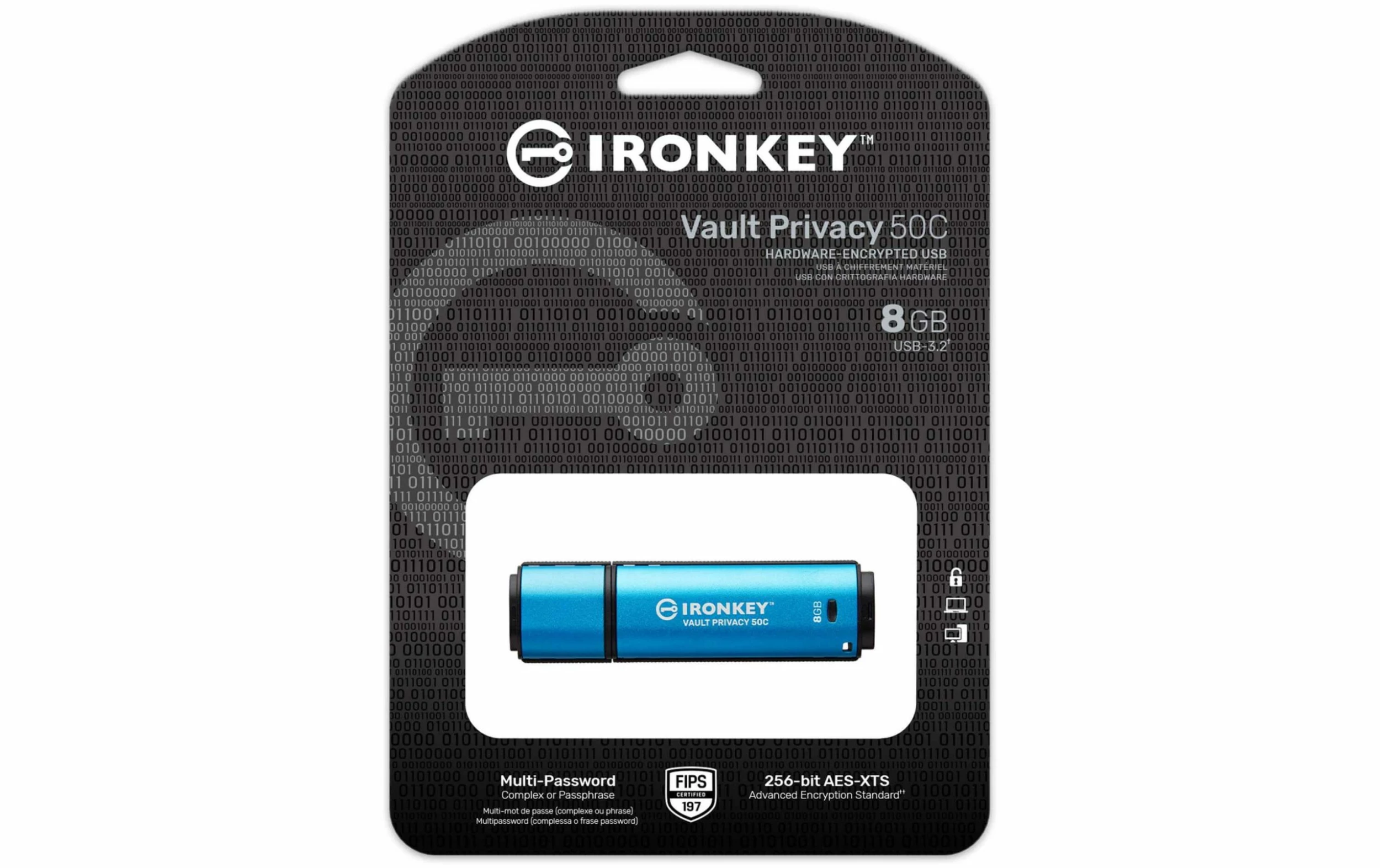 Capacité de mémoire totale: 8 GB, Cryptage du stockage des données: 256-Bit-AES, Couleur de détail: Bleu, Interfaces: Type-C USB 3.0 (3.1 / 3.2 Gen. 1), Forme du périphérique mémoire USB: Standard, Matériau: Non spécifié