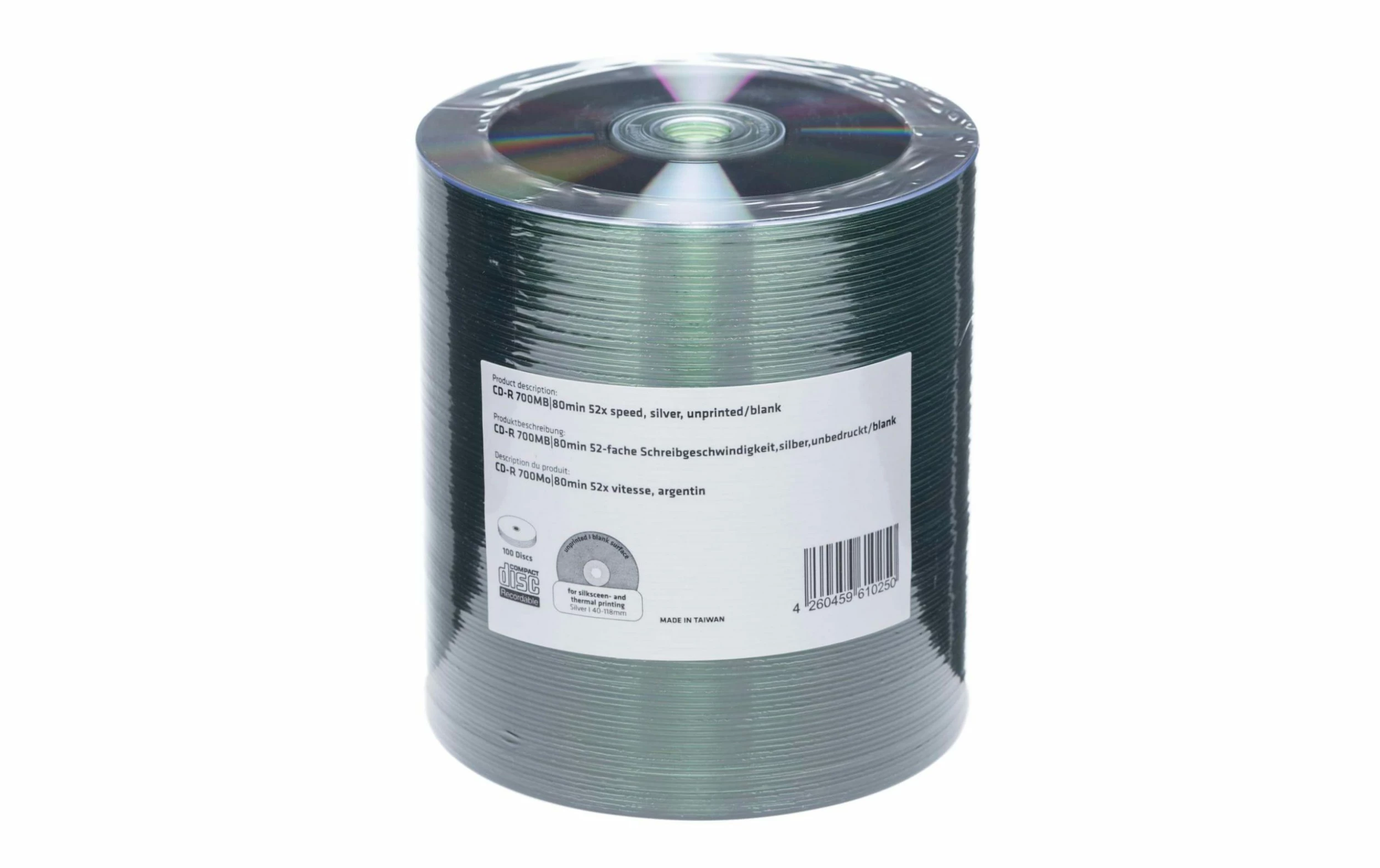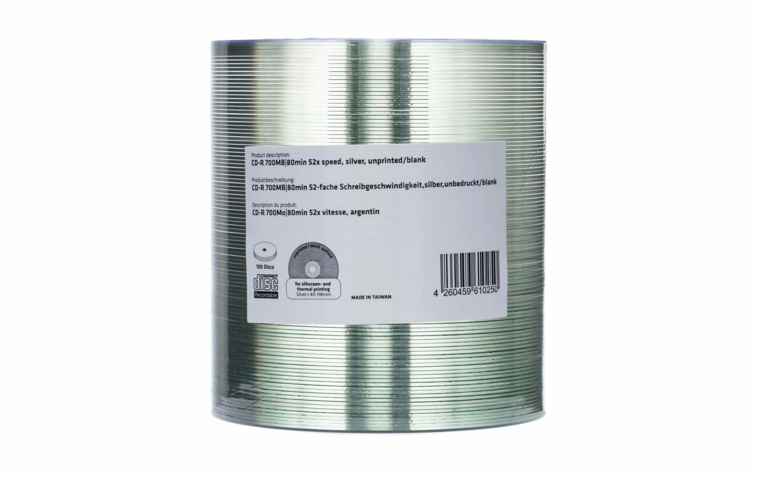 Type de support: CD-R, Capacité de mémoire: 0.7 GB, Caractéristiques du support: Imprimable sur imprimante thermique, Unité d’emballage: 100 Pièce/s, Type de conditionnement: tour